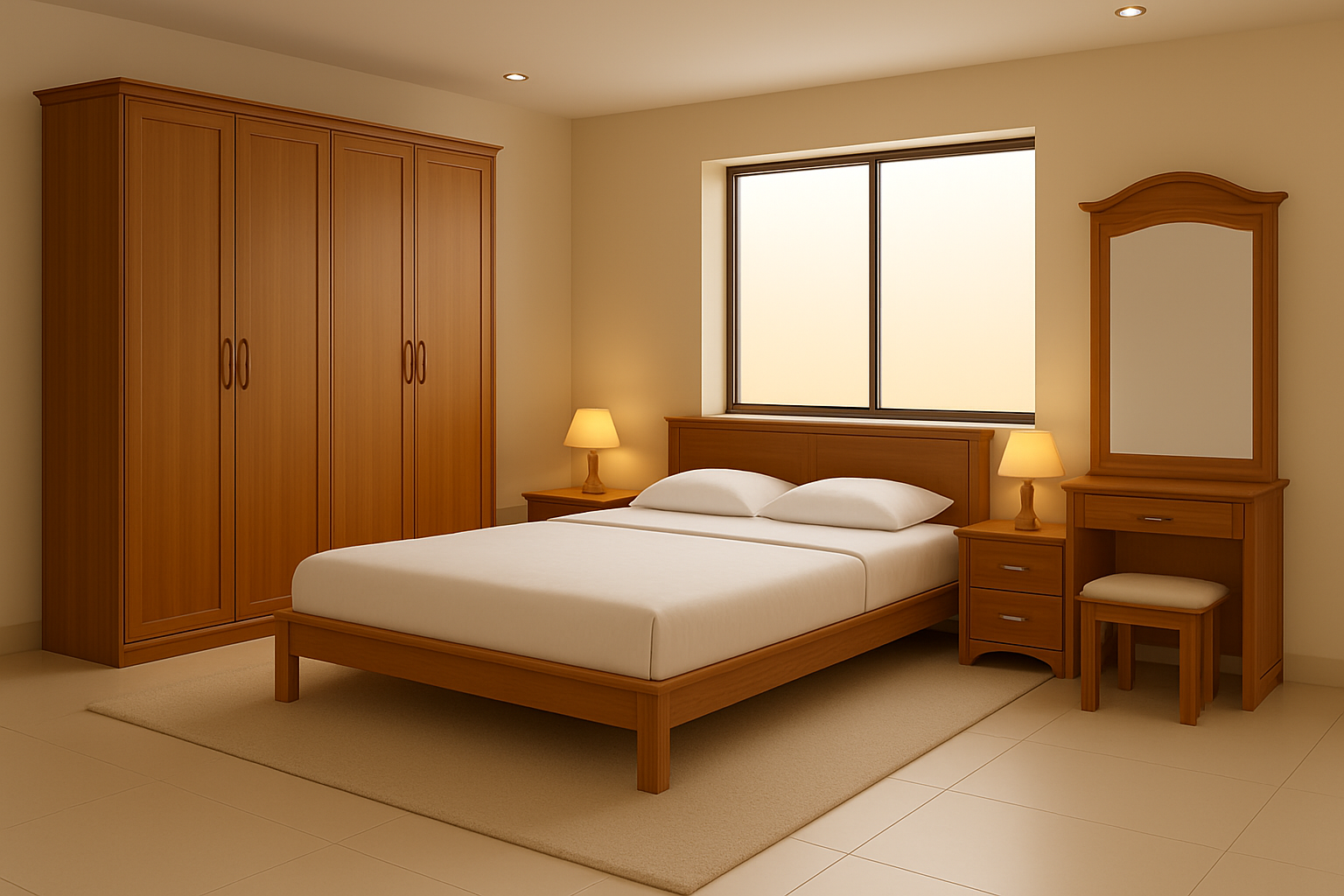 A beautiful Bedroom set made from particle board lamination finished in a warm, light-brown color.