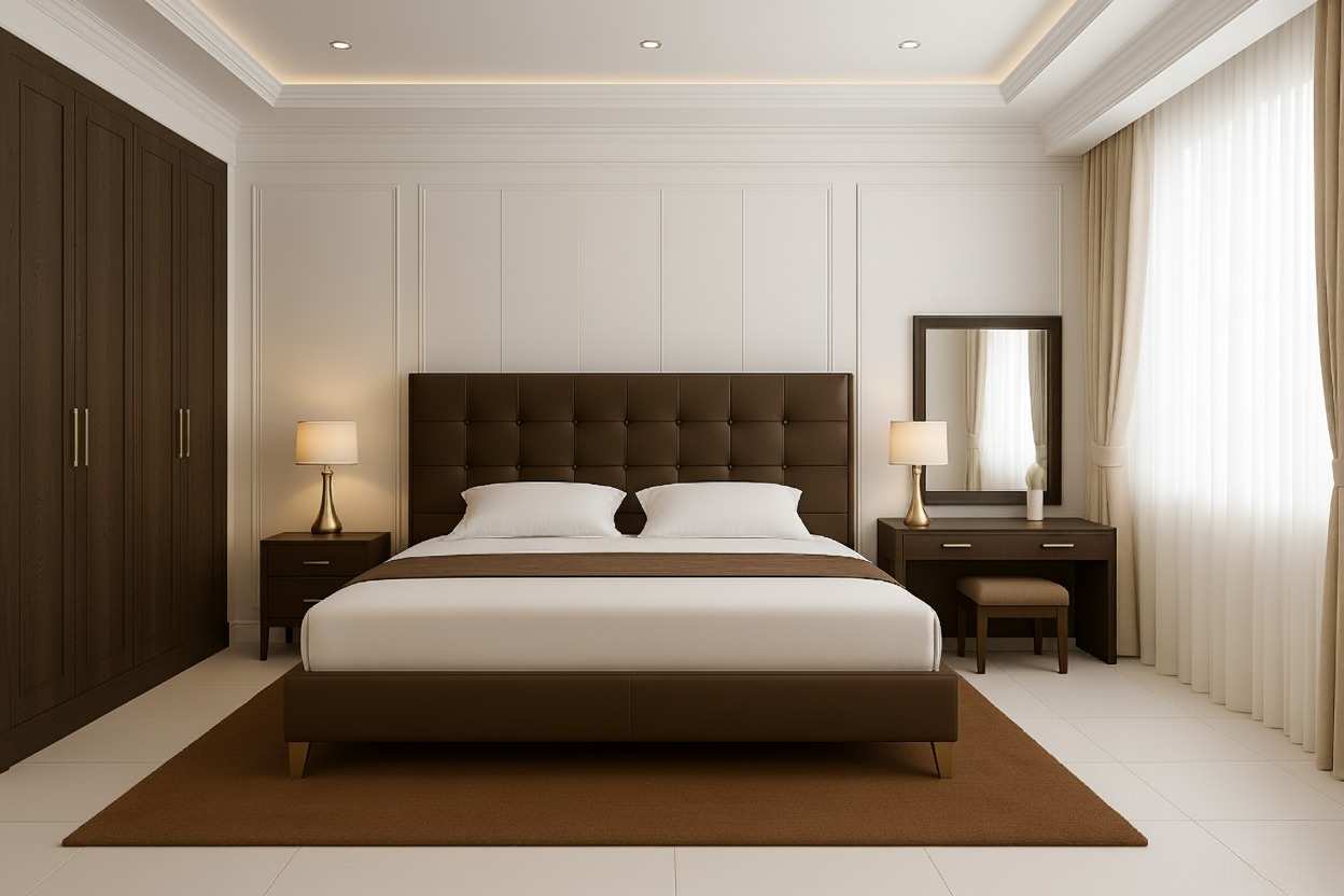 A beautiful Bedroom set in deep walnut brown color is made from high quality laminated particle board, offering durability, smooth finish, and a refined modern appearance. The lamination provides a scratch-resistant and easy-to-clean surface, ensuring long-lasting beauty.