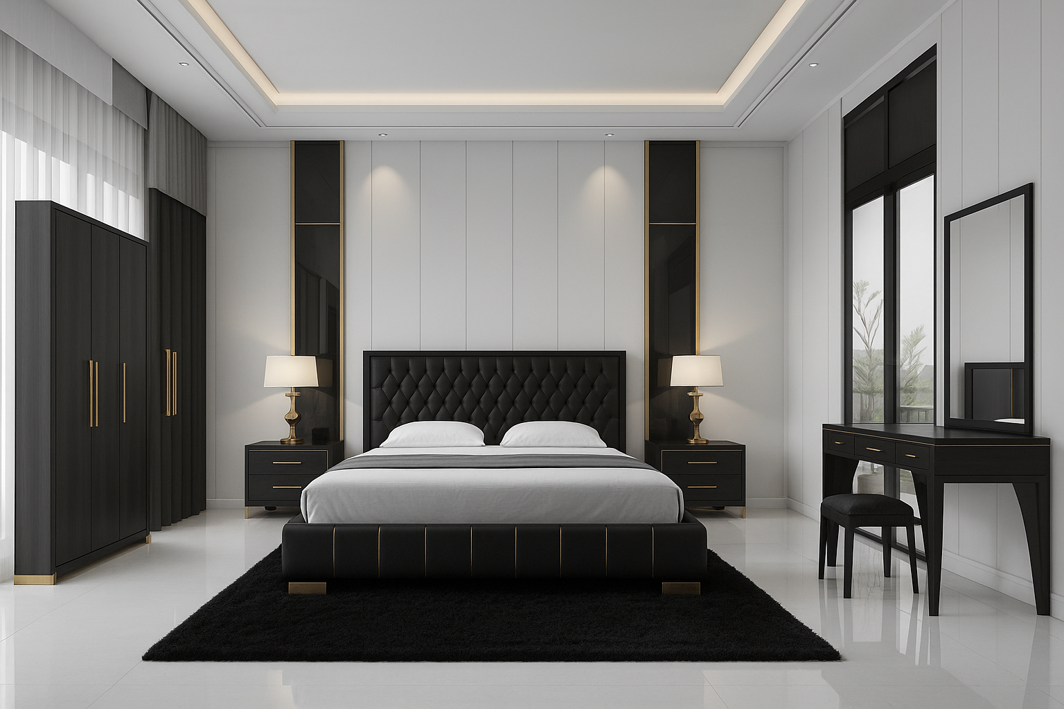 This modern black bedroom set is crafted from high-quality MDF board lamination, giving it a premium contemporary look with long-lasting durability. The rich black finish paired with elegant gold accents creates a luxurious and stylish ambiance, making this set a standout addition to any bedroom.